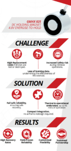 The GMHX 025 electromagnet from Magnet Schultz has proven to be a mission-critical component in target drone recovery systems, ensuring safe parachute deployment, reliable UAV recovery, and cost-effective defence training operations.