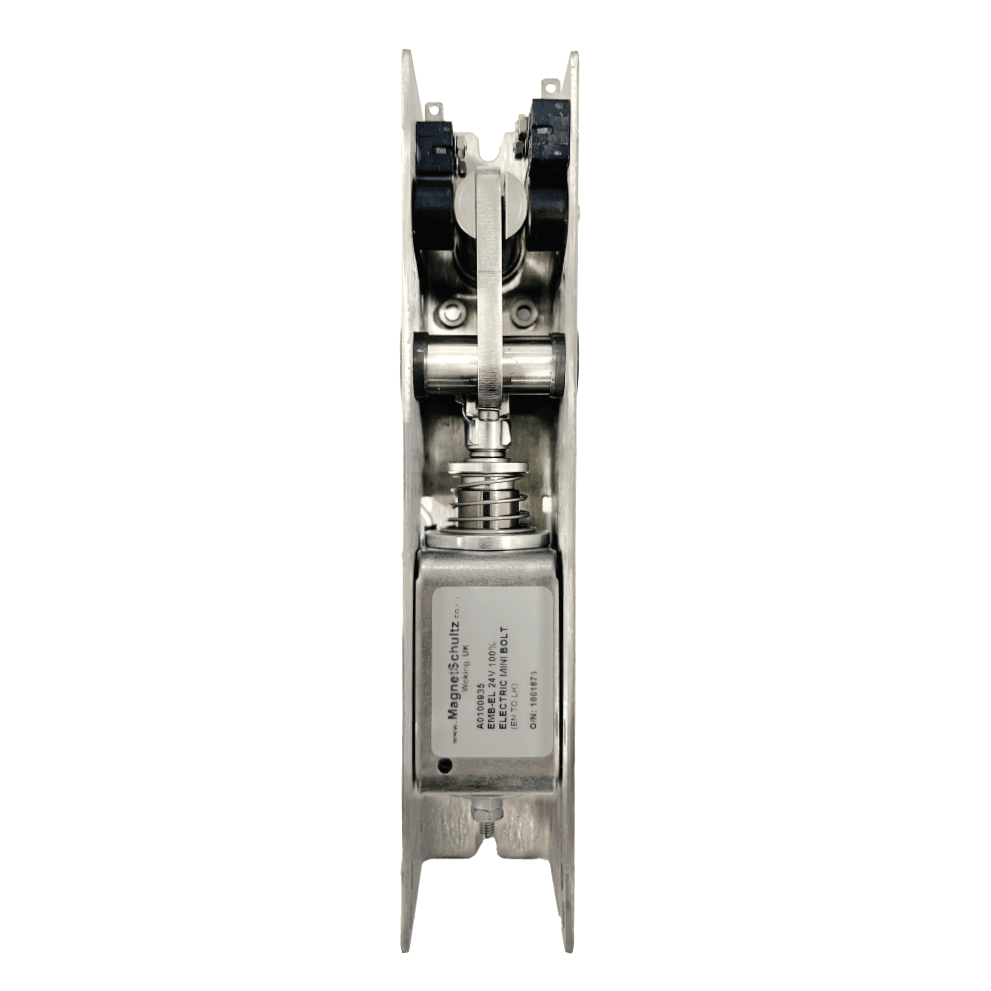 The Electric Mini Bolt (EMB) is a compact, high-performance locking solution for secure retention of hinged or sliding elements such as cabinets, lockers, access hatches, grills, and vents. Available in energise-to-lock (EL) or spring-to-lock (SL) versions, it features a robust 12mm stainless steel bolt and incorporates two position switches to signal bolt position for monitoring and control. The encapsulated solenoid coil, with Class F rated insulation, ensures reliable operation under continuous 100% duty, with maintenance-free bearings for a long service life. Designed for installation in any orientation, the EMB offers corrosion-resistant materials and a manual override for safety. Optional accessories include stainless steel mounting plates, keeper plates for slam-lock use, side mounting options, boxed versions, and custom bolt designs. With a radial bolt load capacity of up to 1000 N, the EMB provides durable, dependable performance in demanding security, access control, and industrial locking applications.